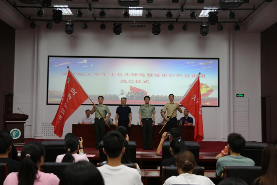 仪式上,魏都区武装部长黄克中为大学生士兵先锋连授旗,校党委宣传部王林部长为党史红色宣讲团授旗。